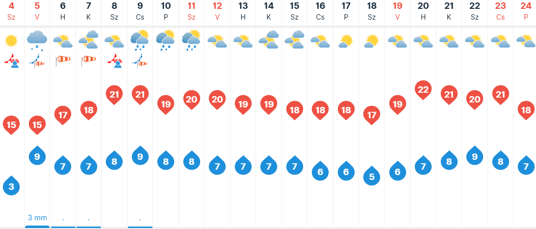 Vasárnap egy hidegfront hatására kezdetben többfelé számíthatunk esőre, záporra, majd délután már kevesebb helyen várható csapadék, és egyre többfelé felszakadozik a felhőzet. Sokfelé lesz élénk, helyenként erős a nyugatira, északnyugatira forduló szél. Hajnalban már sehol sem fog fagyni. Délután 11-17 fokot mutathatnak a hőmérők.