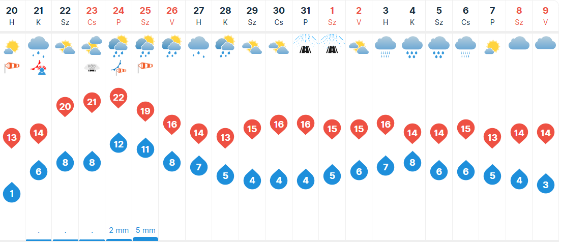 Kedden felhősebb időben lesz részünk, helyenként esős lesz a reggel, napközben elszórtan várható további csapadék. A délies szelet elsősorban délkeleten és a Dunántúlon kísérhetik élénk, néhol erős lökések. Északon, északkeleten 7 és 13, máshol 14 és 20 fok között alakul a csúcshőmérséklet.