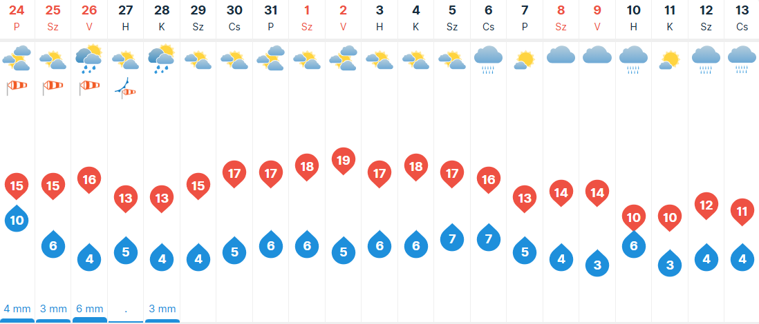 Péntek hajnalban és reggel a hidegfront hatására többfelé számíthatunk esőre, záporra, néhol zivatarra. Az előrejelzések szerint Kecskemétet sem kerüli el ekkor a csapadék. Napközben fog felszakadozni a felhőzet, délutánra pedig kisüt a nap. Élénk, erős, több helyen viharos lesz a nyugatira, északnyugatira forduló szél. Délután 13-18 fokot mérhetünk majd városunkban.