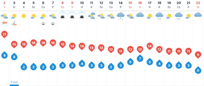 Hétfőre virradóan az érkező hidegfront esőt, záporokat hoz, jelentősebb mennyiség nyugaton eshet. Délután kelet felé távozik a csapadákzóna, nyugat felől már délelőtt csökkenni kezd a felhőzet, délután a középső részeken és a Tiszántúl egy részén is kisüt a nap. Feltámad az északnyugatira forduló szél, többfelé erős, a Dunántúlon néhol viharos lehet. Pár fokkal visszaesik a hőmérséklet, kora délután 13-17 fok valószínű.