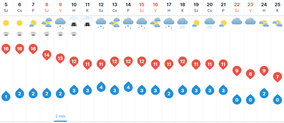 Csütörtök reggelre ismét többfelé képződik pára, köd, amely helyenként tartósabban megmaradhat, ugyanakkor az ország nagyobb részén napos időben lesz részünk. Számottevő csapadék sehol sem várható, de a ködös tájakon szitálás, hajnalban akár ónos szitálás sem kizárt. A legmagasabb hőmérséklet 11 és 17 fok között alakul.