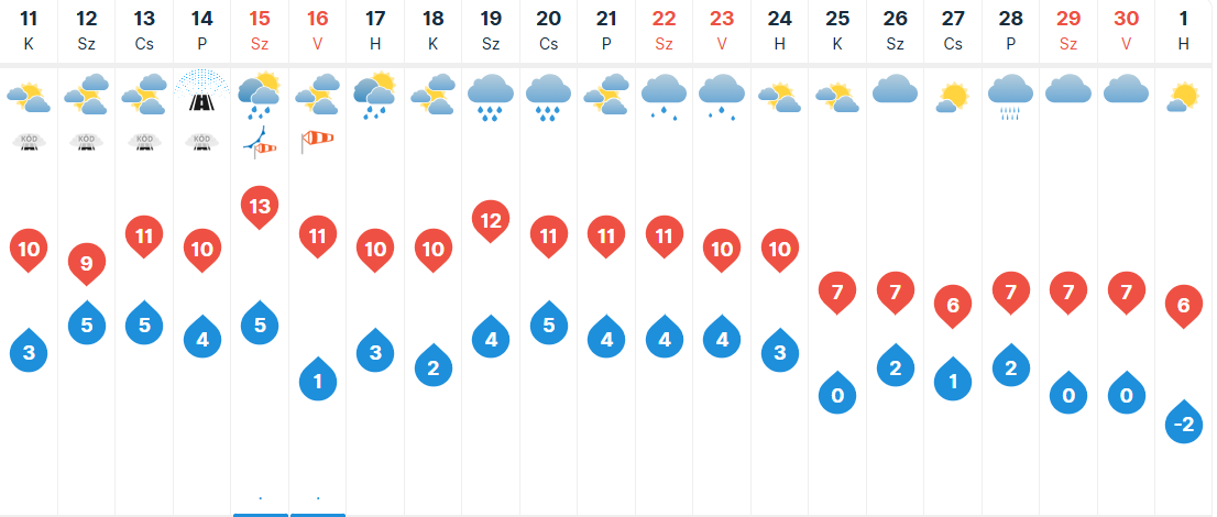 Szerdán már a szürke, egész nap párás, ködös tájak lesznek túlsúlyban, csak kevés helyen süthet ki hosszabb időszakokra a nap. Ködszitálás továbbra is előfordulhat. Hajnalban -1 és +6, míg kora délután 5 és 12 fok között alakulhat a hőmérséklet.