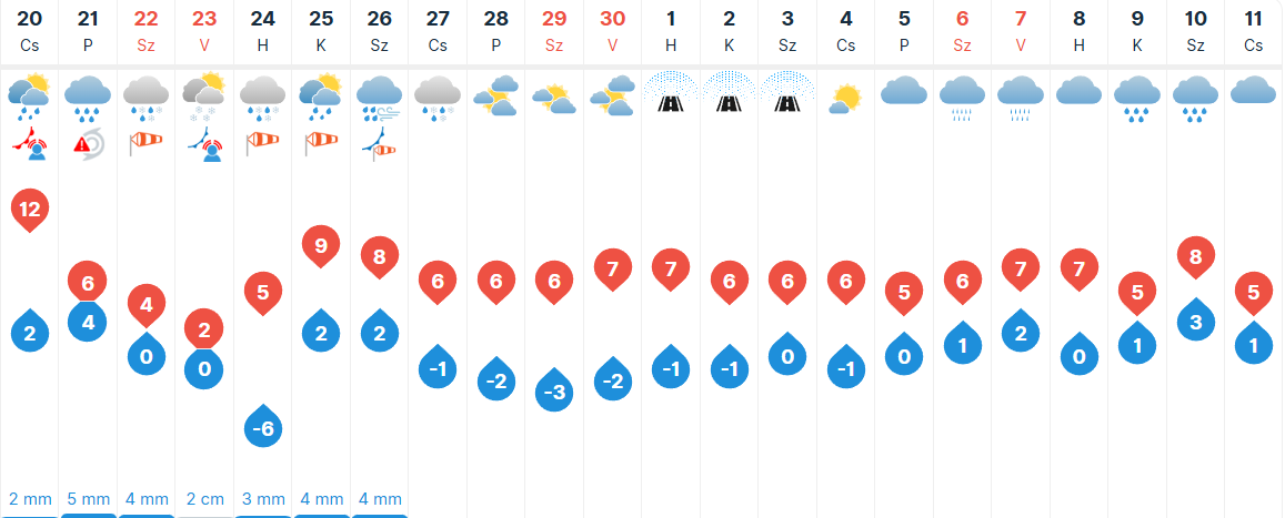 Péntekre egy mediterrán ciklon hoz borongós, sokfelé csapadékos időt, legfeljebb keleten, délkeleten szakadozhat fel időnként a felhőzet. Az ország nagy részén eső várható. Sokfelé lesz élénk, erős, néhol viharos az északi, északnyugati szél. Hajnalra +4 fokra csökken a hőmérséklet. A csúcshőmérséklet 6 fok körül alakul Kecskeméten, nyugaton, északnyugaton és északon marad hidegebb az idő.