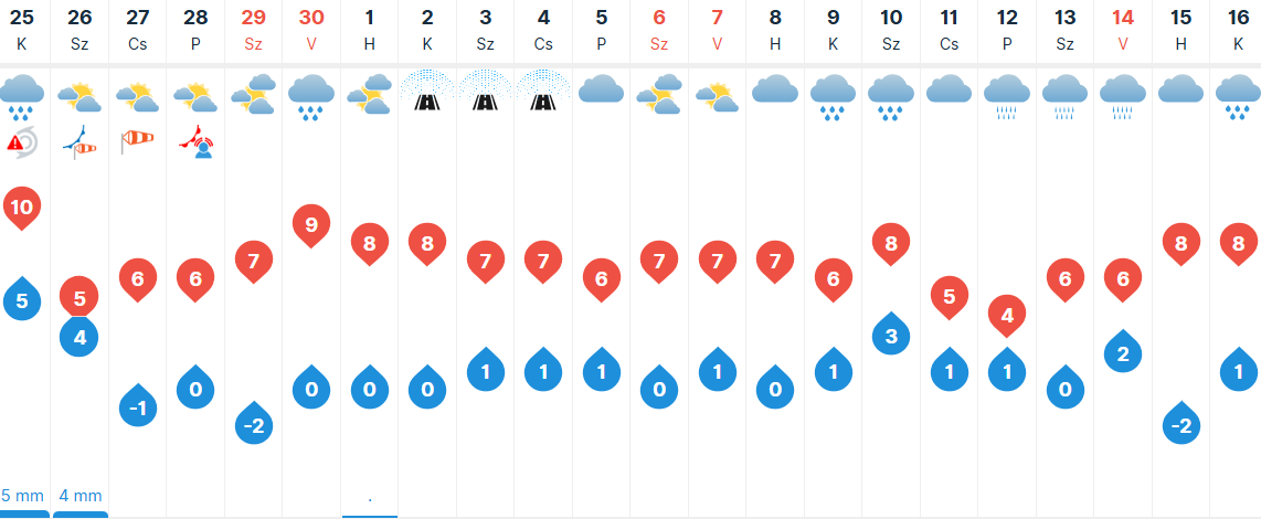 Kedden egy újabb mediterrán ciklon hoz országszerte esős időt, valamint helyenként havas eső is előfordulhat. Napközben kevesebb, estétől egyre több helyen lehet élénk, erős a légmozgás is. Nagy lesz a hőmérsékleti kontraszt, kora délután 4-15 fokra van kilátás, az Alföld déli felén mérhetjük majd a legmagasabb értékeket.