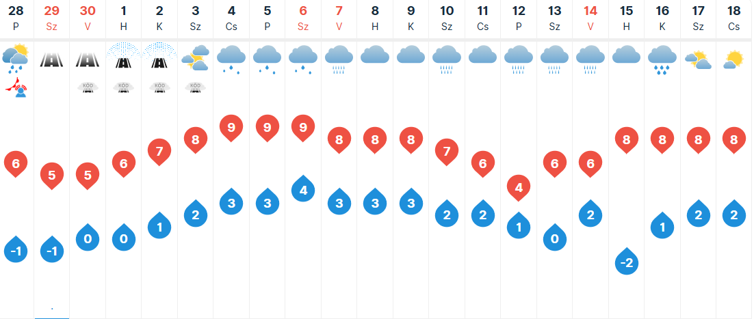 Szombat főként az ország délkeleti felén lesz erősen felhős, borongós az idő. Délen gyenge eső is előfordulhat. Hosszabb napos időszakok északnyugaton várhatóak. Hajnalban több helyen alakulhat ki pára, köd. A csúcshőmérséklet 2 és 8 fok között alakulhat.