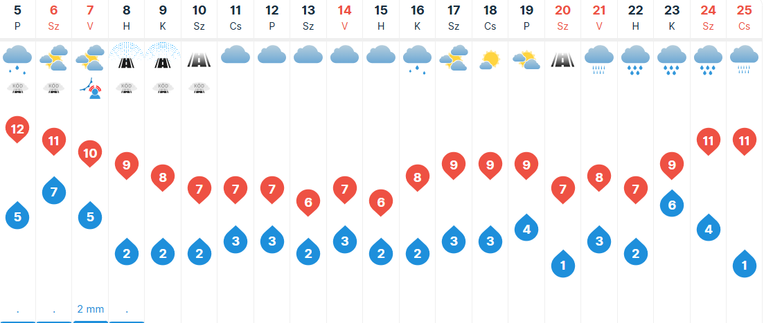 Szombaton a nap első felében a Dunától keletre akár hosszabb időszakokra is előbújhat a nap, majd később itt is erősen megnövekszik a felhőzet. Reggel délnyugaton, kora este a Dunántúlon egyre többfelé eshet az eső. Az Időkép szerint hajnalra több helyen pára, köd képződhet. Nem lesz jelentős a légmozgás. Napközben 7 és 13 fok között alakul a hőmérséklet.