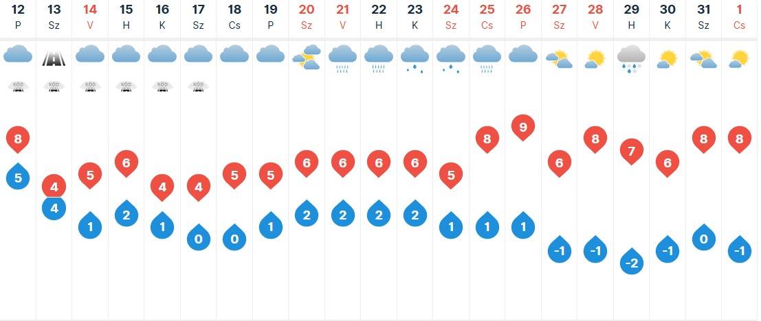 Pénteken sem változik időjárásunk Kecskeméten. Szürke, borongós, többfelé napközben is párás, ködös időben lesz részünk. Helyenként szitálás, ködszitálás is előfordulhat, a nyugatias szél azonban gyenge, és mérsékelt marad. A csúcshőmérséklet 3-9 fok között alakul.