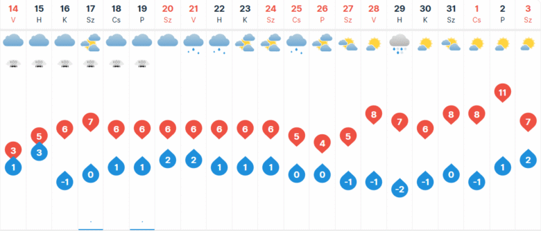 Vasárnap az ország nagy részén folytatódik a borongós, párás, ködös idő. Helyenként szitálás, ködszitálás, kezdetben néhol ónos ködszitálás is előfordulhat. Napos időszakokra a legmagasabb hegycsúcsok mellett elsősorban helyenként északnyugaton és északkeleten mutatkozik esély. A nyugati, északnyugati, majd a délnyugati szél általában gyenge, mérsékelt marad. A legalacsonyabb hőmérséklet Kecskeméten -2 és +4 fok között alakul, majd napközben 1 és 7 fok közötti maximumokat mérhetünk.