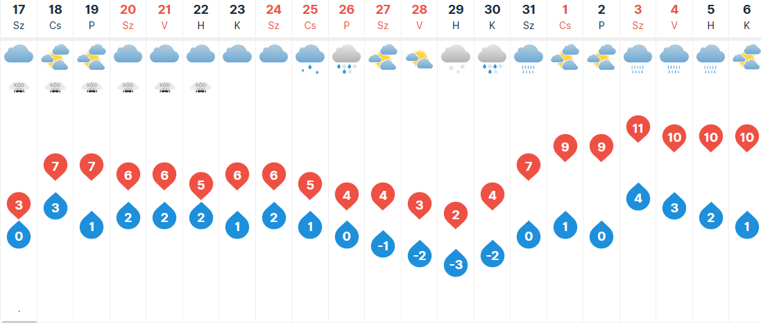 Csütörtökön többfelé elvékonyodhat a felhőzet, délen akár hosszabb napos időszakok is lehetnek. Viszont lesznek tartósan borongós, elsősorban nyugaton ködös tájak is. Szitálás, északkeleten néhol gyenge eső előfordulhat. A délies légmozgás gyenge, mérsékelt lesz. A csúcshőmérséklet 3-11 fok között valószínű.