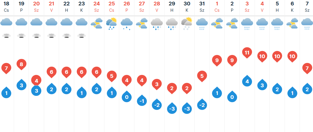 Pénteken is elsősorban délen van esély kevés napsütésre, hazánk nagy részén borongós, ködös, szürke idő várható. Néhol gyenge eső, szitálás, ködszitálás, átmenetileg ónos szitálás továbbra is kialakulhat. A szél nem lesz jelentős. A -2, +5 fokos hajnalt követően napközben 3-12 fok ígérkezik, a naposabb déli tájakon lesz a legmelegebb.