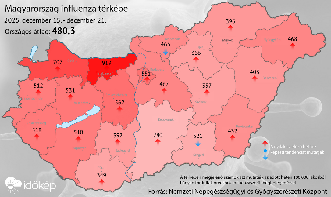 Az Időkép influenzatérképe a 2025-ös év 51. hetére vonatkozóan.