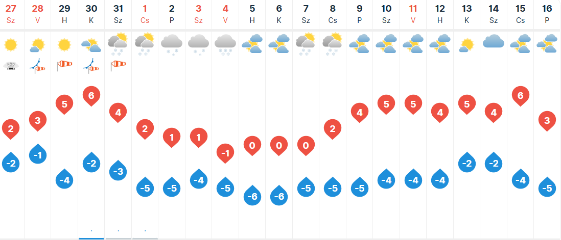 Vasárnapra egy hidegfront hoz erős, viharos északnyugati szelet. A változóan felhős-napos időben csak néhol fordulhatnak elő futó hózáporok. A legmagasabb hőmérséklet 1 és 6 fok között alakulhat.