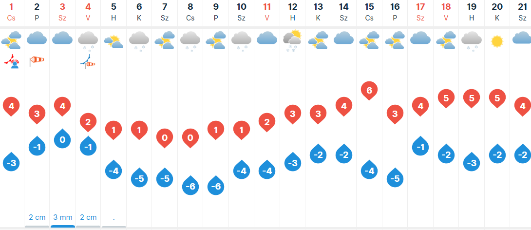 Pénteken a felhőké lesz a főszerep, főként az ország déli, délkeleti felén fordulhat elő eső, zápor, keletebbre havas eső, néhol hó is hullhat, de átmenetileg ónos eső sem kizárt. A délnyugati szelet többfelé kísérhetik élénk, keleten, északkeleten erős széllökések. Kora reggel 0, napközben 4 fok körüli csúcshőmérsékletre számíthatunk.