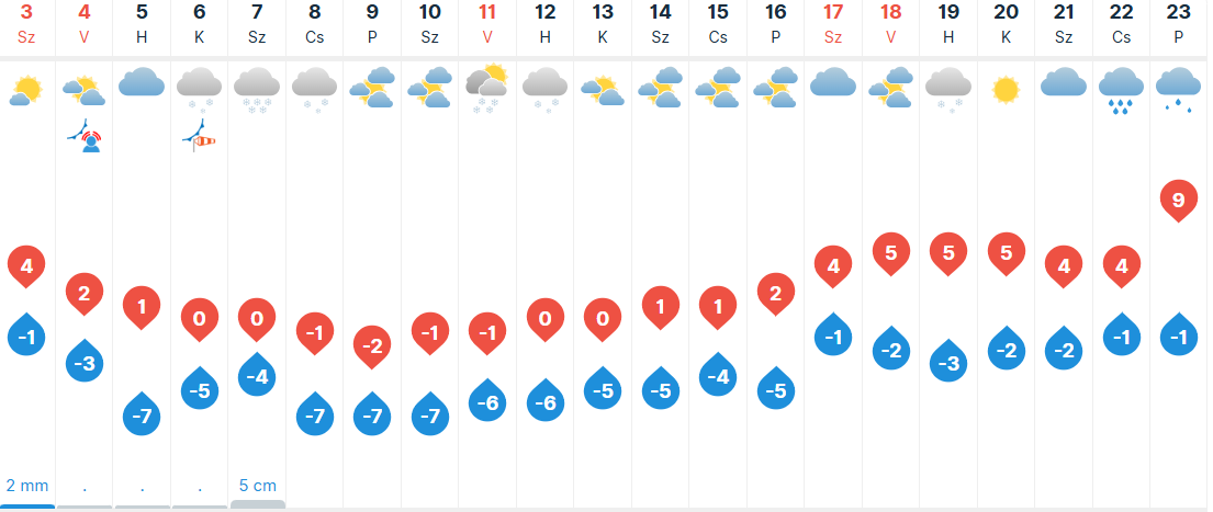 Vasárnapra virradóan nyugaton, majd délen, később keleten várható többfelé hóba váltó csapadék. Napközben ismét egyre többfelé csökken a felhőzet észak felől, de a déli tájak azonban felhősebbek maradhatnak. Több helyen élénk, néhol erős lesz a nyugati, északnyugati szél. Sokfelé fagyos lesz a reggel, majd a legmagasabb hőmérséklet -2 és +3 fok között alakulhat.