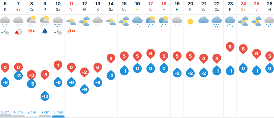 Szerdán átmeneti szünetekkel továbbra is sokfelé számíthatunk havazásra, ugyanis térségünk időjárását továbbra is egy mediterrán ciklon alakítja majd. Sokfelé lehet élénk, erős az északias szél, ami hófúvásokat okozhat. Napközben szinte mindenhol fagypont alatt maradhat a hőmérséklet, -6 és -1 fok közötti maximumokra van kilátás.
