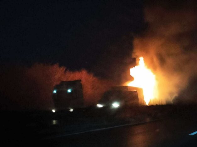 Eloltották a lángokat a kecskeméti tűzoltók az M5-ös autópályán, ahol egy kamion gyulladt ki a Budapest felé vezető oldalon, Kecskemét térségében, a 89-es kilométerszelvénynél. A nyerges vontató pótkocsija égett teljes terjedelmében. Az érintett sztrádaszakaszt teljes szélességében lezárták – közölte kedden reggel 8-kor a katasztrófavédelem. Tamás olvasónk videót is küldött, jelenleg így fest a helyszín: