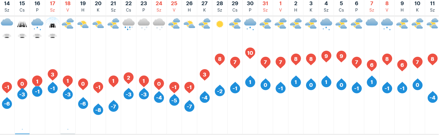 Csütörtökön is marad a túlnyomóan borult, párás, egyes részeken tartósan ködös idő, mindössze délnyugaton vékonyodhat a felhőzet. A légmozgás nagyrészt gyenge, mérsékelt marad. A legalacsonyabb éjszakai hőmérséklet -6 és +2, a legmagasabb nappali hőmérséklet általában -2 és +4 fok között alakul.