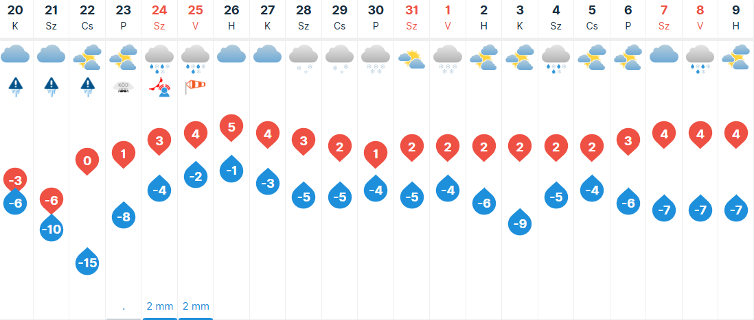 Szerdán kezdetben párás, ködös, borongós, illetve naposabb tájak is lehetnek. Napközben dél felől megnövekedhet a fátyolfelhőzet, de többfelé számíthatunk hosszabb-rövidebb napos időszakokra. Az Alföldön és nyugaton lehetnek tartósan borongós, ködös tájak is. Számottevő csapadék sehol sem várható. Folytatódik a hideg idő: hajnalban -20 és -8, kora délután pedig -7 és +1 fok között alakulhat a hőmérséklet.