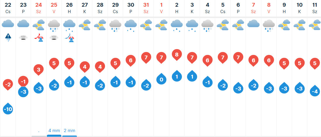 Pénteken keleten maradhat tartósan borult az idő, míg a Dunántúlon hosszabb-rövidebb időre kisüthet a nap. Néhol vegyes halmazállapotú csapadékra is számíthatunk, de nem nagy mennyiségben. Gyenge, mérsékelt lesz a légmozgás. Reggel -4 fok körüli értékeket mutathatnak a hőmérők, napközben pedig -2 és +5 fok között alakulhat a legmagasabb hőmérséklet.