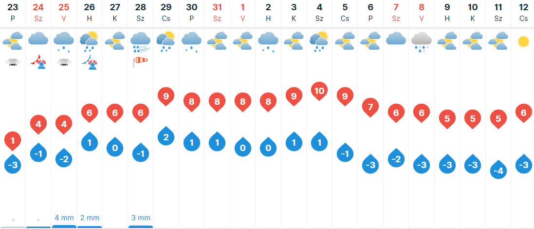 Szombaton többfelé erősen felhős, borult, kezdetben párás, ködös időre van kilátás. Helyenként vegyes halmazállapotú csapadék is előfordulhat, nyugaton és a középső tájakon eső, északon, északkeleten ónos eső. Hajnalban -4, +1, kora délután 0, +8 fok között alakulhat a hőmérséklet.