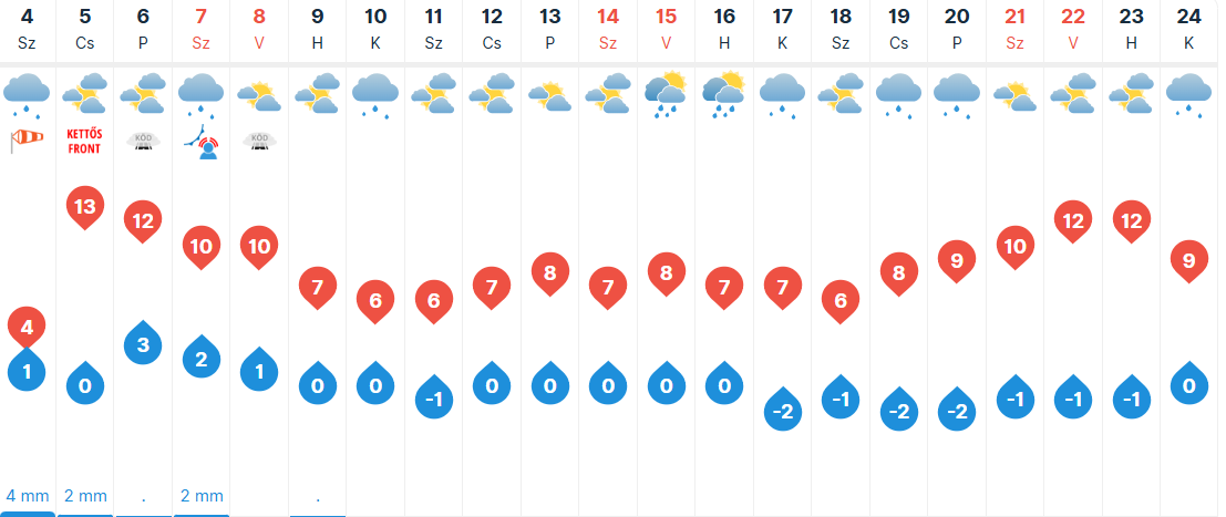 Csütörtökön még több tájegységünkön kialakulhat eső, zápor, ugyanakkor többfelé szakadozhat fel napközben a felhőzet, és süthet ki rövidebb-hosszabb időszakokra a nap. Sokfelé lesz élénk, helyenként erős a keleti, délkeleti, majd a délies szél, viszont estére mindenhol mérséklődik, illetve legyengül a légmozgás. Reggel -1 és +5, kora délután pedig 4 és 15 fok között alakul a hőmérséklet, délkeleten lesz a legmelegebb.