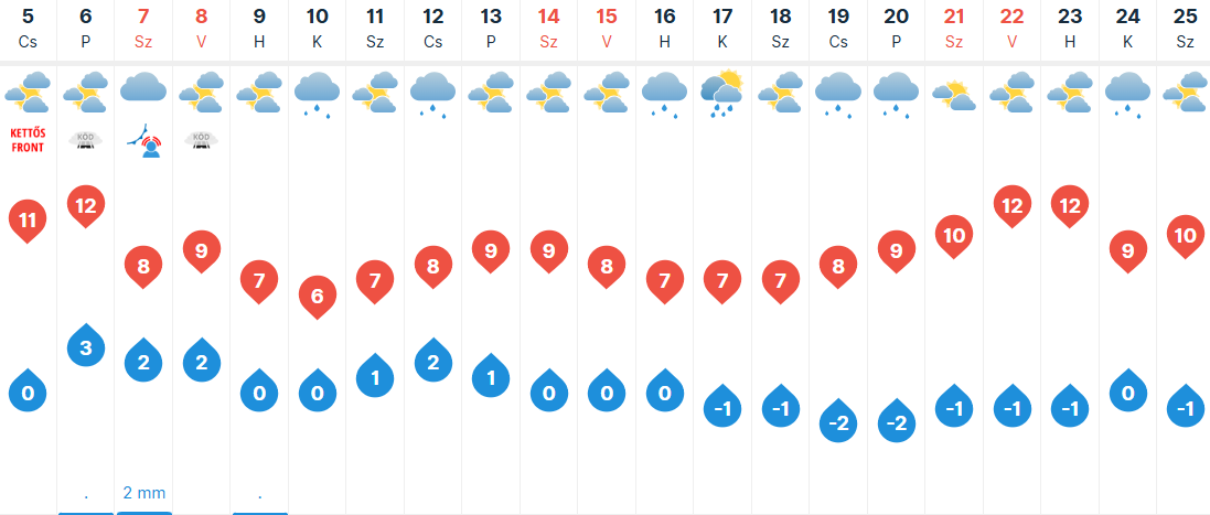 Pénteken naposabb és felhősebb tájak és időszakok váltakoznak majd. Gyenge esőre főként északkeleten lehet számítani, majd késő délután, este nyugaton, délnyugaton kisebb eső, zápor is kialakulhat. Helyenként élénk lesz a déli, délkeleti szél. Hajnalra, reggelre többfelé képződhet pára és köd. A legmagasabb hőmérséklet 4 és 14 fok között alakul.