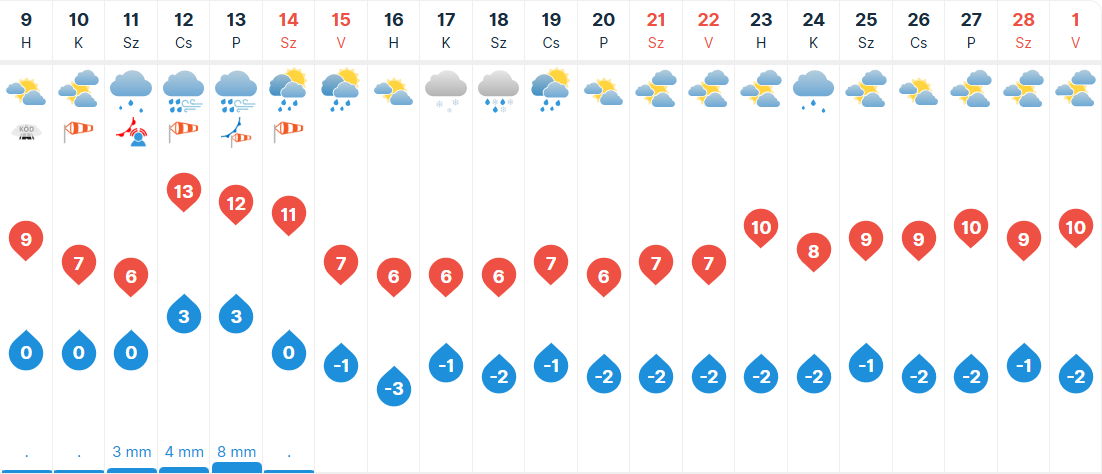 Kedden elsősorban a Dunántúlon, valamint helyenként a középső tájakon várható többórás napsütés, keleten, északkeleten sokfelé viszont egész nap borongós maradhat az idő. Keleten előfordulhat kisebb eső, zápor, de az Északi-középhegységben és északkeleten néhol havas eső, kisebb havazás sem kizárt. A keleti és az északkeleti tájak kivételével többfelé élénk, helyenként erős lesz a délkeleti szél. Reggel -4 és +2, napközben pedig 2 és 9 fok között alakul a hőmérséklet.