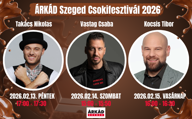 Ha idén nem egy sablonos Valentin-napot szeretnél, hanem egy igazi közös élményt, akkor mutatjuk a tervet: február 13–15. között jön az ÁRKÁD Szeged Csokifesztivál, ahol nemcsak kóstolók és édes finomságok várnak, hanem Takács Nikolas, Vastag Csaba és Kocsis Tibor is színpadra lép. Kecskemétről egy órás út, élményből viszont bőven több lesz.