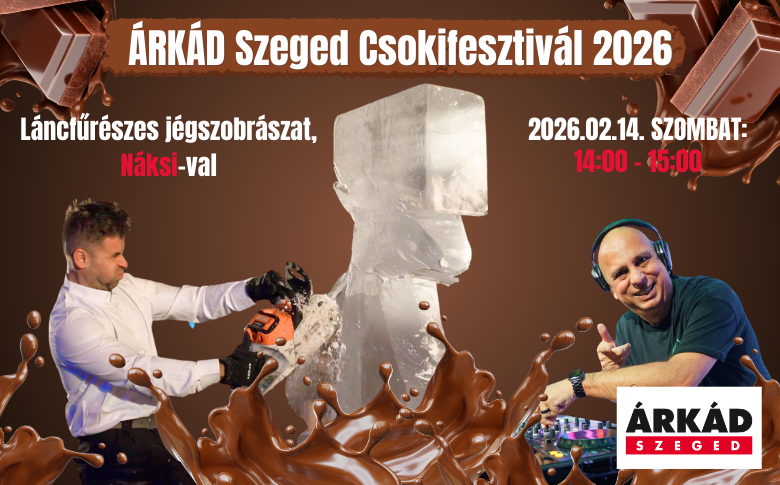 Ha az a cél, hogy idén ne csak ajándék legyen, hanem közös emlék is, akkor az ÁRKÁD Szeged Csokifesztiváljára megéri elnéznetek: három napon át várnak a kézműves csokoládék és pralinék, csokicasinó, 3D csokinyomtatás, kétméteres szerencsekerék és egész nap pörgő programok várnak. Szombaton 14:00-kor látványos láncfűrészes jégszobrász-show kezd, a tempót Náksi adja, utána páros trüffel-kóstoló és „jégszív csók”, 15:00-kor pedig Vastag Csaba mini koncertje koronáz. Családdal, barátokkal vagy kettesben is telitalálat.