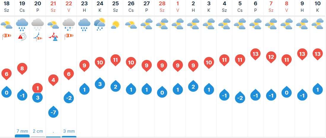 Csütörtökön egy közeledő mediterrán ciklon hozhat borongós, szürke időt, valamint esőt, helyenként havas esőt, havazást, esetleg ónos esőt. Többfelé kiadósabb mennyiségű csapadékra van kilátás. Élénk, több helyen erős lesz a délies szél. Reggelre mindenhol fagypont alá csökkenhet a hőmérséklet, napközben pedig nagy hőmérsékleti kontraszt alakulhat ki, északon 0, +4, délen 9-15 fok közötti értékeket mérhetünk.