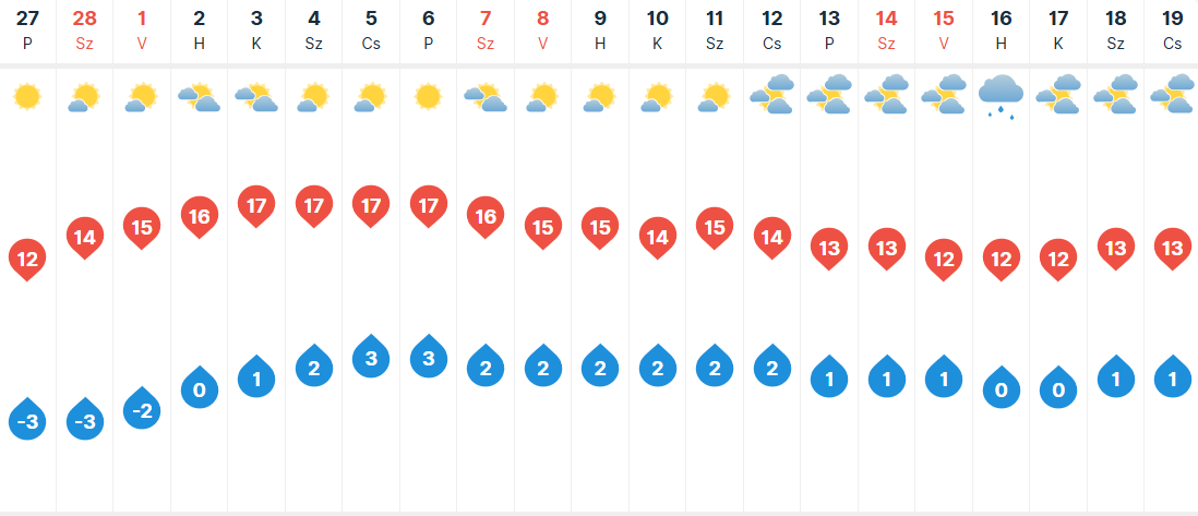 Hétvégén túlnyomóan napos, száraz időre van kilátás, csapadék sehol nem várható. A többnyire délkeleti irányú légmozgás főként szombaton támadhat fel a Dunántúl északi felén és helyenként a középső országrészben. Hajnalonként a legtöbb helyen fagyni fog, délutánonként pedig 12-17 fokra készülhetünk.