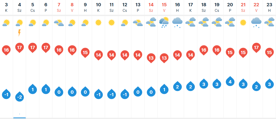 Szerdán a Dunától keletre túlnyomóan napos időben lesz részünk, a Dunántúlon viszont gyakrabban zavarhatják gomolyfelhők a napsütést, és helyenként zápor, zivatar is kialakulhat. A szél csak záporok, zivatarok környékén támadhat fel átmenetileg. Hajnalra egyes tájainkon pára, köd képződik. Reggel 1, délután pedig 13 és 18 fok között alakul a hőmérséklet.