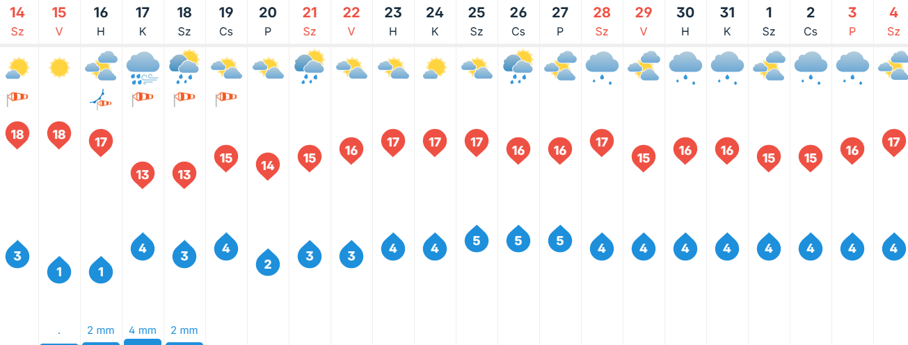 Szombaton marad az alapvetően napos idő, az időnként megnövekvő gomolyfelhőkből csupán néhol alakulhat ki egy-egy futó zápor, kis eséllyel zivatar. A déli, délkeleti szél sokfelé élénk, erős lesz. A legalacsonyabb hőmérséklet 3 fok körül alakul, majd napközben 18 fok lehet Kecskeméten.