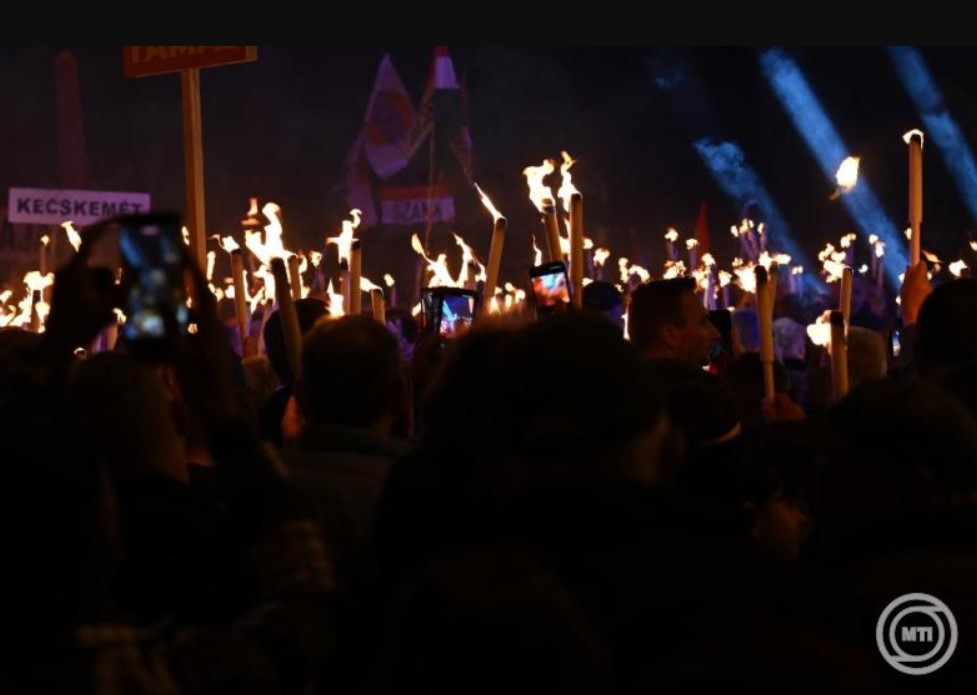 A lap azt írja, hogy itt is hamar megérkezett a válasz a fideszellenes tüntetőkre. Egy tízfős, feketébe öltözött ellentüntető társaság eléjük vonult és megpróbálta lekiabálni őket „Hajrá Fidesz!” és „Ukrán Tisza!” skandálással. A két csapat egymástól fél méterre állva kiabálta a másik arcába a rigmusait.