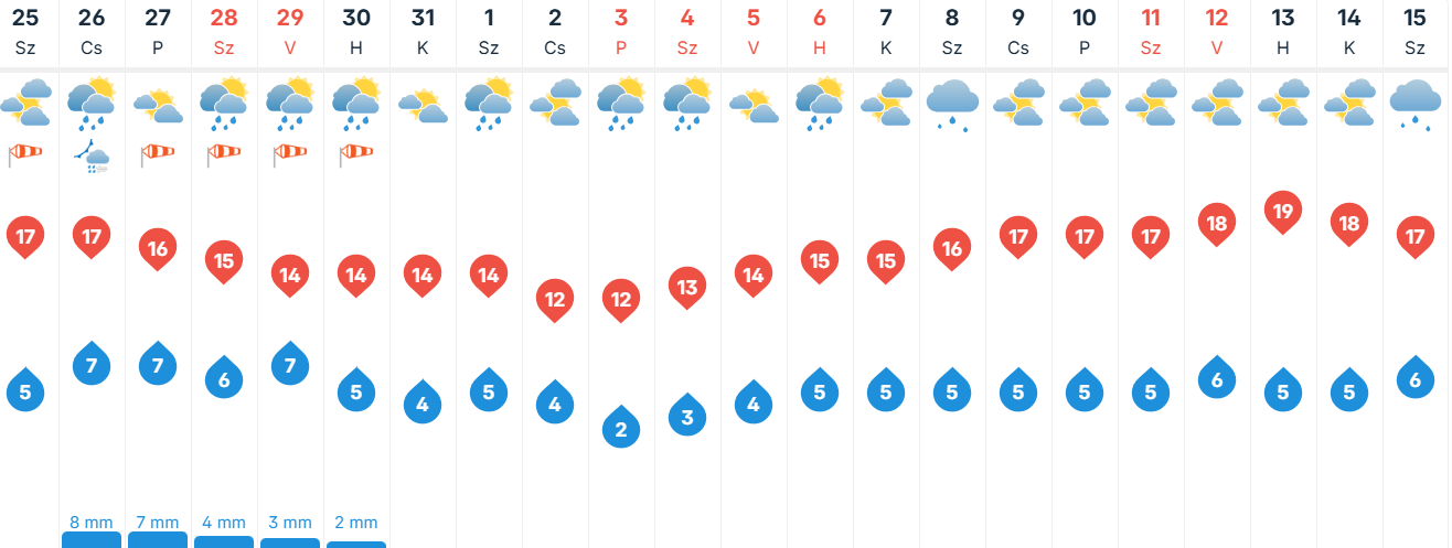 Csütörtökön már egy mediterrán ciklon okozhat nagy kontrasztot. A Dunántúlon borongós idő jöhet kiadós esővel, az Alpokalján és a Bakonyban havas eső, hó is hullhat, valamint erős, viharos lökések kísérhetik az északias szelet. Itt csak 3 és 12, a Dunától keletre még 13 és 20 fok között alakulhat a csúcshőmérséklet. Utóbbi tájakon még hosszabb-rövidebb időre kisüthet a nap, majd itt is egyre többfelé eleredhet az eső. Errefelé a déli-délkeleti szelet kísérhetik élénk, erős lökések.