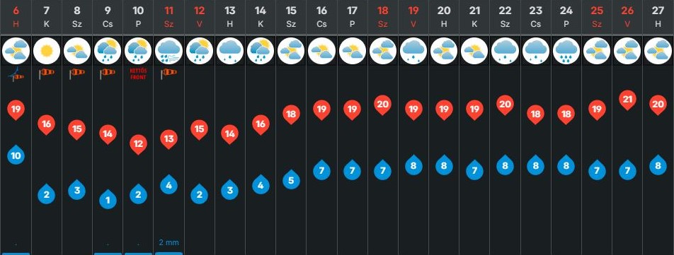 Az Időkép előrejelzése szerint hétfő reggel és délelőtt erősen felhős idő várható, kisebb eső, futó zápor előfordulhat Kecskeméten. Délután már szakadozik a felhőzet, és több-kevesebb napsütés is lehet. Az északnyugatira forduló szél élénk, időnként erős lesz. A hőmérséklet napközben kb. 18–21 °C között alakul.