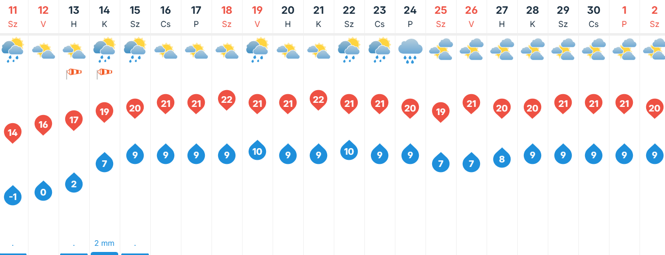 Szombaton kezdetben még erősebben megnövekedhet a felhőzet, de azért napsütésre is számíthatunk Kecskeméten. Elszórtan kialakulhat kisebb eső, gyengébb zápor is. Az északnyugati szelet élénk lökések kísérhetik. Hajnalban többfelé várható fagy, -5, +6 fokig csökken a hőmérséklet. Délutánra 11 és 17 fok közé melegszik a levegő hőmérséklete.