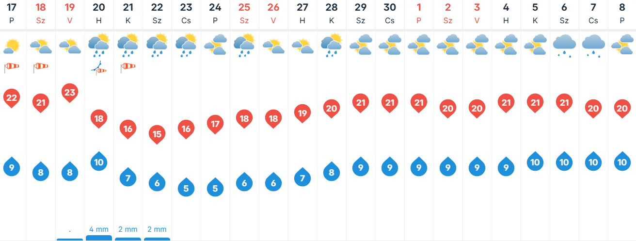 Pénteken sok napsütésben lesz részünk Kecskeméten, de időnként megnövekszik a felhőzet, és elvétve kialakulhat egy-egy futó zápor, néhol akár zivatar is. Többfelé élénk lesz az északias szél. Kora reggel 4 és 11, délután pedig 18 és 24 fok között alakul a hőmérséklet.