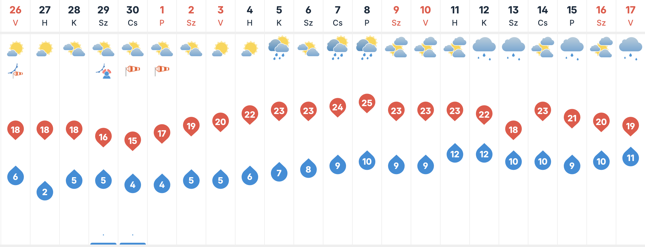Vasárnap a hőmérséklet 18 fog körül fog alakulni Kecskeméten, az égbolt napos lesz, felhőkkel csak elszórtan találkozhatunk – tökéletes lesz tehát az időjárás szabadtéri programokhoz és kiránduláshoz. Viszont a frontérzékenyeknek rossz hírünk van: hidegfront érkezik, ami panaszokat okozhat.