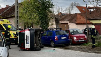 Két autó ütközött Kecskeméten az Akácfa utca közelében, az egyik az oldalára borult