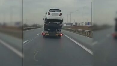 Kicsi a rakás: autószállító tréler, platós kisteherautó és egy személyautó – ilyen horrorpiramist sem láttunk még az M5-ösön Bács-Kiskun vármegyében (videó)